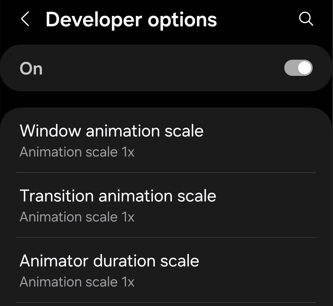 These three settings Window animation scale, Transition animation scale, and Animator duration scale need to be set to 1x instead of Off.
